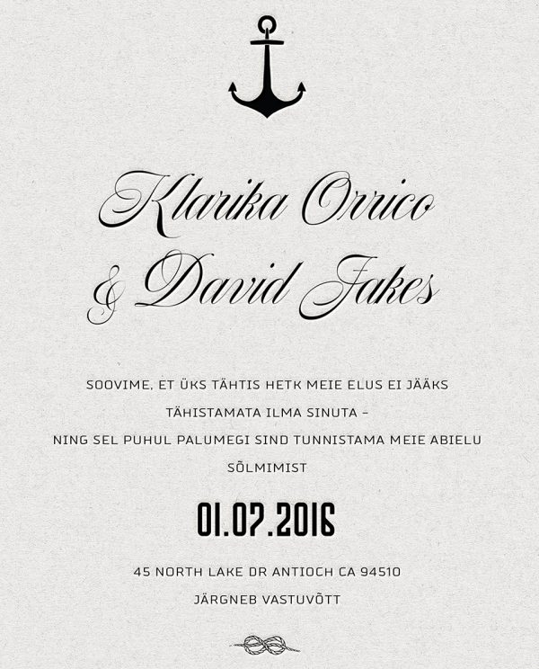 Pildil oleva kaardikujundusetekst on näidis, mille asemele ootame Sinu vajaduste kohast ja personaalset pulmakutse sisendit (kirjuta sisend “Lisa märkused” väljale). Loomulikult lubame oma pulmakutse teksti kirjutamisel meie näidisest šnitti võtta.